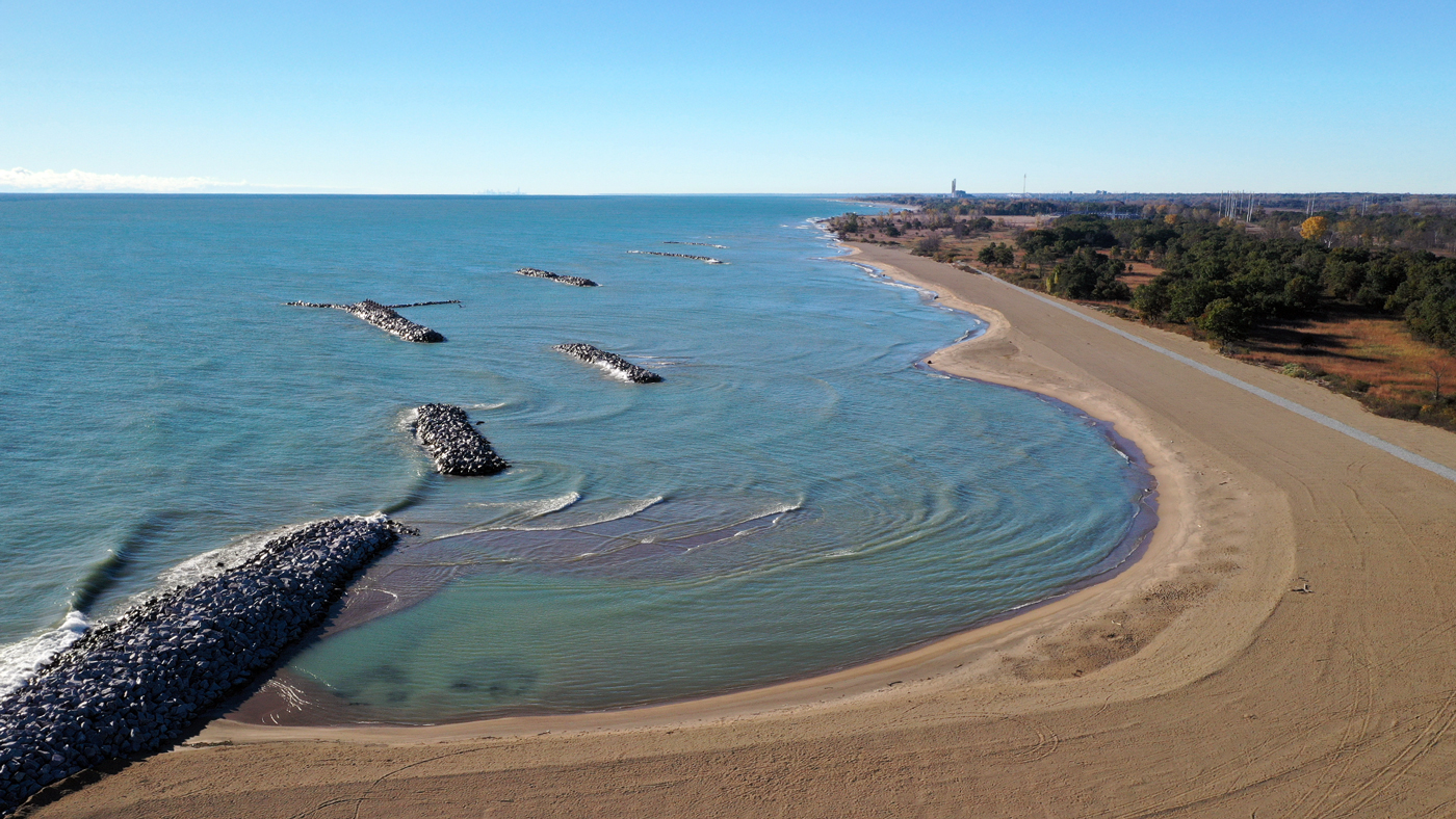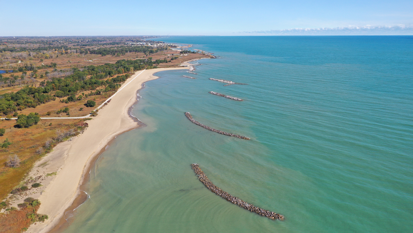 The Illinois Beach State Park Shoreline Stabilization project in Zion, Illinois was selected as a Best Restored Beach from The American Shore and Beach Preservation Association (ASBPA) in 2024. The project combined beach nourishment for a recreational beach and a coastal habitat restoration component protecting state park infrastructure and critical habitats. Due to a recent shoreline retreat in Illinois as high as 100 feet in one year, there was an urgent need to preserve the remaining coastal area. To create a shoreline stabilization strategy compatible with preserving the natural setting, Edgewater designed a full protection system including the placement of over 300,000 tons of stone to form a series of offshore detached breakwaters. The offshore structures are configured to embody both aquatic and avian habitat enhancing features for added eco-value.